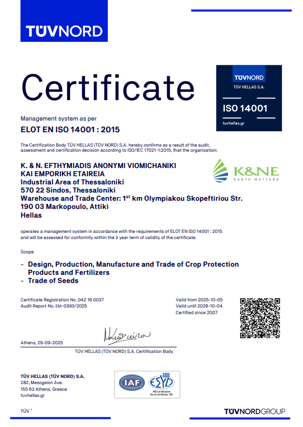 K&N EFTHYMIADIS SINGLE MEMBER S.A. is certified according to ISO 14001 by TUV HELLAS [Certificate Νο. . 042 16 0037] for the the scope of "Design, production, packaging and trade of crop protection products and fertilizers – Trade of seeds".