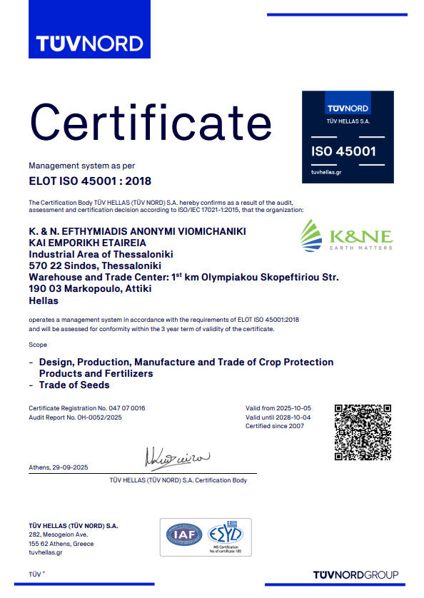 K&N EFTHYMIADIS SINGLE MEMBER S.A. is certified according to ISO 45001 by TUV HELLAS [Certificate Νο. 047 07 0016] for the scope of "Design, production, packaging and trade of crop protection products and fertilizers – Trade of seeds".